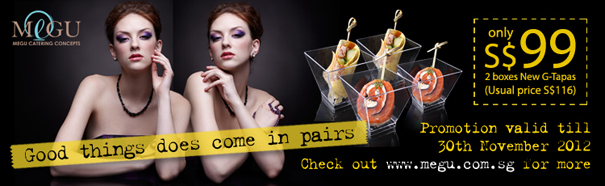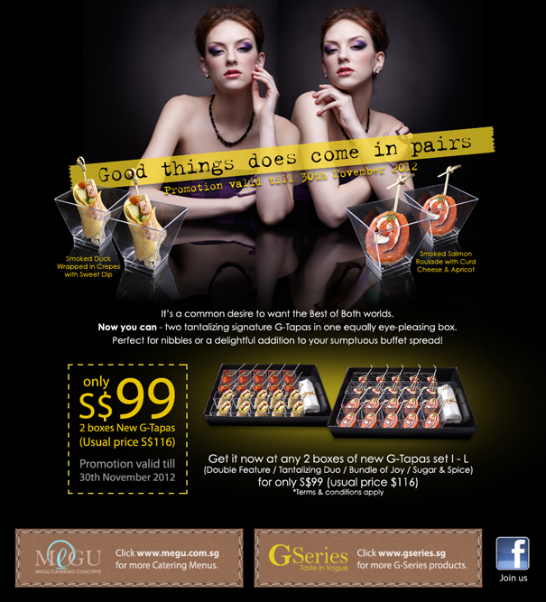 Gourmet Series 2 in 1 tapas menu - Good things does come in pairs idea for this taste in vogue promotion. It's a common desire to want the best or both worlds. Now you can - two tantalizing signature G-Tapas in one equally eye-pleasing box.